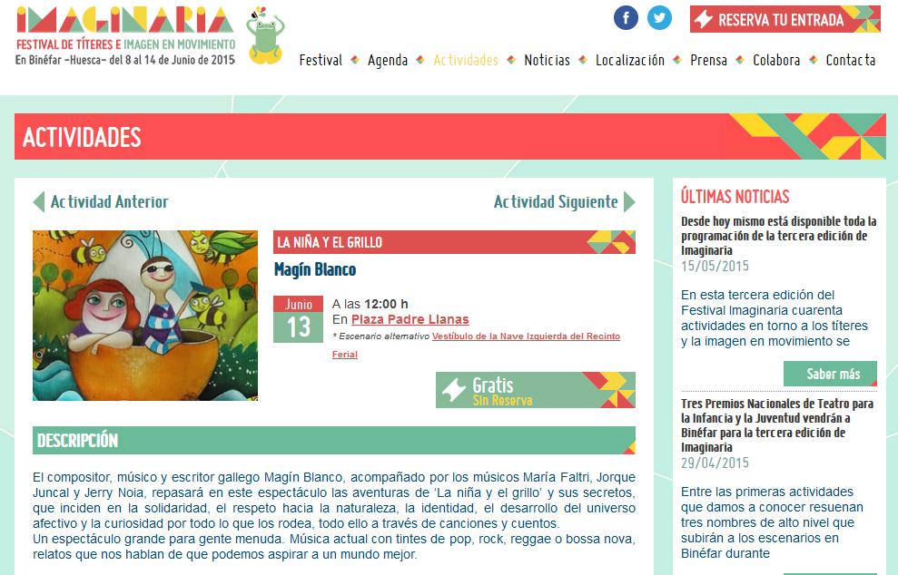 Magín Blanco estará el próximo sábado 13 de junio en el Festival Imaginaria, con el espectáculo “La niña y el grillo en un barquito”. El festival Imaginaria es un certamen de títeres e imagen en movimiento organizado en Binéfar, Huesca.